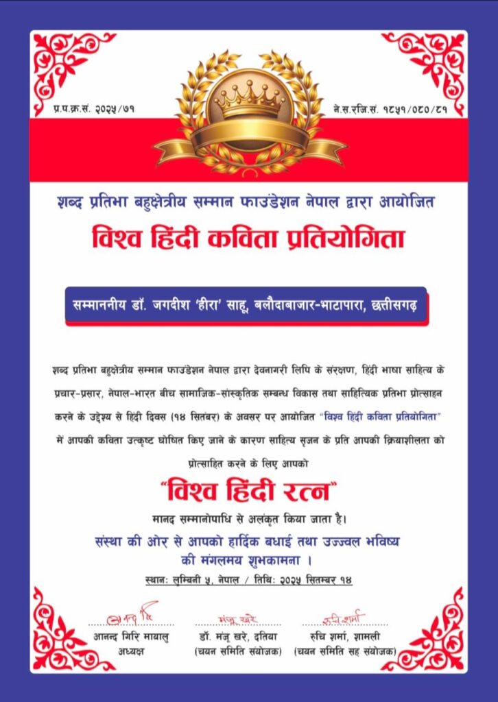 भाटापारा/khabar-bhatapara.in:- शब्द प्रतिभा बहुक्षेत्रीय सम्मान फाउंडेशन नेपाल द्वारा हिंदी दिवस के अवसर पर विश्व हिन्दी कविता प्रतियोगिता का आयोजन किया गया, जिसमें बलौदाबाजार -भाटापारा जिले के ख्यातिलब्ध साहित्यकार, अंतर्राष्ट्रीय कलाकार एवं व्याख्याता डॉ. जगदीश हीरा साहू को शब्द प्रतिभा बहुक्षेत्रीय सम्मान फाउंडेशन नेपाल द्वारा देवनागरी लिपि के संरक्षण, हिंदी भाषा साहित्य के प्रचार-प्रसार, नेपाल-भारत बीच सामाजिक-सांस्कृतिक सम्बन्ध विकास तथा साहित्यिक प्रतिभा प्रोत्साहन करने के उद्देश्य से हिंदी दिवस (१४ सितंबर) के अवसर पर आयोजित “विश्व हिंदी कविता प्रतियोगिता” में डॉ. जगदीश “हीरा” साहू की कविता को उत्कृष्ट घोषित करते हुए साहित्य सृजन के प्रति क्रियाशीलता को प्रोत्साहित करने के लिए “विश्व हिंदी रत्न मानद सम्मानोपाधि से अलंकृत किया गया। ग्राम कड़ार निवासी, शा.उ.मा. वि. डमरू (बलौदाबाजार) के व्याख्याता के पद पर कार्य करने वाले जगदीश “हीरा” साहू किसी परिचय के मोहताज नहीं है। उनके खाते में एक और विशिष्ट उपलब्धि जुड़ गई। जगदीश हीरा साहू गत 17 वर्षों से शिक्षा विभाग में शिक्षक के रूप में कार्य कर रहे हैं। जिसके लिए हाल ही में शिक्षक दिवस के दिन राज भवन के दरबार हाल में महामहिम राज्यपाल श्री रमेन डेका, माननीय मुख्यमंत्री श्री विष्णु देव साय, स्कूल शिक्षा मंत्री माननीय श्री गजेन्द्र यादव की उपस्थिति में छत्तीसगढ़ के सर्वोच्च शिक्षक पुरस्कार “राज्य स्तरीय शिक्षक सम्मान” दिया गया। साथ 27 वर्षों से साहित्यिक और सांस्कृतिक विधा की सेवा करते हुए अपनी विशिष्ट पहचान बनाये हुए हैं। अब तक इनकी विशिष्ट उपलब्धि हेतु तिहरा मानद डॉक्टरेट उपाधि, 20 से अधिक विश्व रिकार्ड, 15 से अधिक अंतर्राष्ट्रीय सम्मान सहित साहित्यिक और सांस्कृतिक क्षेत्र में हजारों सम्मान प्राप्त हो चुके हैं। डॉ. जगदीश हीरा साहू बलौदाबाजार जिले के ख्यातिलब्ध साहित्यकारों में से एक हैं। इनकी इस उपलब्धि पर इष्टजनों, मित्रों तथा शुभचिंतकों ने हार्दिक शुभकामनाएं प्रेषित की है।