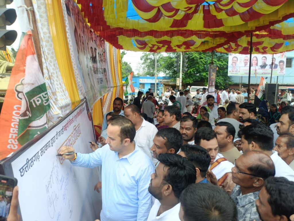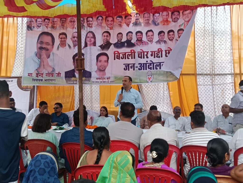 जिसमे युवा कांग्रेस ने नाका नंबर 1 भामाशाह चौक से आतिशबाजी के साथ स्वागत कर ऑटो ई रिक्सा मोटर सायकल रैली निकालते कांग्रेस भवन पहुँचे राष्ट्रपिता महात्मा गांधी जी के प्रतिमा पर माल्यार्पण कर कार्यक्रम का शुरुआत किया गया बिजली चोर गद्दी छोड़ जन आंदोलन,आमसभा,व हस्ताक्षर अभियान चलाया गया आमसभा में जनसमूह को संबोधित किये प्रदेश प्रभारी अमित सिंह पठारीय जी,सह प्रभारी डॉ मोनिका मांडरे जी,जिलाध्यक्ष सुमिंत्रा घृतलहरे जी,सुनील माहेश्वरी, सतीश अग्रवाल,शुशील शर्मा,अमित बंटी शर्मा,शैलेन्द्र बंजारे,बिजली चोर गद्दी चोर कार्यक्रम को संबोधित किये पूरे कार्यक्रम का मंच संचालन जिला उपाध्यक्ष मनमोहन कुर्रे ने किया कार्यक्रम में प्रमुख रूप से ब्लॉक अध्यक्ष अरुण यादव,महिला ब्लॉक अध्यक्ष प्रमिला साहू सेवादल जिलाध्यक्ष निर्मला कोसले, पार्षद शेखर चक्रधारी, पार्षद अजय ठाकुर,सत्येंद्र चेलक, आसिफ खान,पलास मल्होत्रा,जित्तू शर्मा,दिवाकर मिश्रा, नितिन शुक्ला शुक्ला,आलोक मिश्रा, सीरीज जांगड़े, नानू सोनी,नवीन बक्स,गोपाल शर्मा, शैलेंद्र अहिरवार,विक्की ठाकुर,सचीन शर्मा,कुमारी जांगड़े,पूर्णिमा, बिमलेश्वरी ध्रुव,विधानसभा प्रभारी अर्जुन सिंह,मोहन निषाद अध्यक्ष विधानसभा भाटापारा,राजा तिवारी, मुकेश हेंवार,रोहित साहू,सत्यजीत शेन्डे,गोविंदा देवदास,किशन निर्मलकर,आदिल चनिजा,मुकेश साहू,दुर्गेश साहू नरेंद्र ब्राह्मणकर,शशांक चौबे,आकिब मेमन,हरीश लहरे,सादाब जलियावाला,अमित मार्कण्डेय,विजय महिलांगे,गोल्डी मरैय्या,पुनीत मनिकपुरी, ओमप्रकाश यदु,सद्दाम खान,संजय शर्मा,चंदन यदु,किरत वर्मा,शेषनारायण यदु,शौरभ कामरी,वसीम खान,किशन रात्रे,सतीश गेंडरे,तिलक लहरे,महेंद्र साहू,खुमेश,तेजेश्वर,कोमल,मनीष दोण्डे,बलराम साहू,आदि बहुतायत संख्या में युवा कांग्रेस के साथी उपस्थित रहे।।