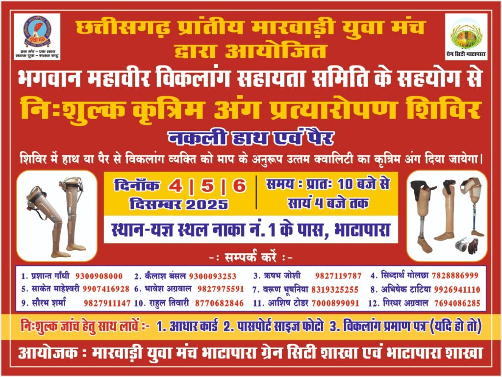 भाटापारा/khabar-bhatapara.in:- अखिल भारतीय मारवाड़ी युवा मंच की प्रांतीय इकाई छत्तीसगढ़ प्रांतीय मारवाड़ी युवा मंच एवम श्री भगवान महावीर विकलांग सेवा समिति के संयुक्त तत्वावधान में 4,5,6 दिसंबर 2025 को यज्ञ स्थान नाका नंबर एक तरेंगा रोड में मारवाड़ी युवा मंच भाटापारा ग्रेनसिटी ,भाटापारा शाखा एवं जागृति शाखा द्वारा दिव्यांगजनों के लिए निःशुल्क कृत्रिम अंग प्रत्यारोपण शिविर का आयोजन किया जा रहा है।